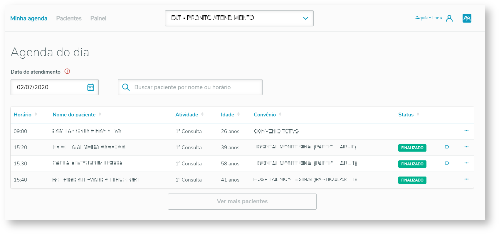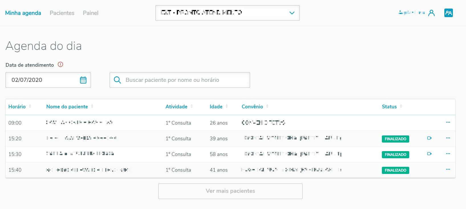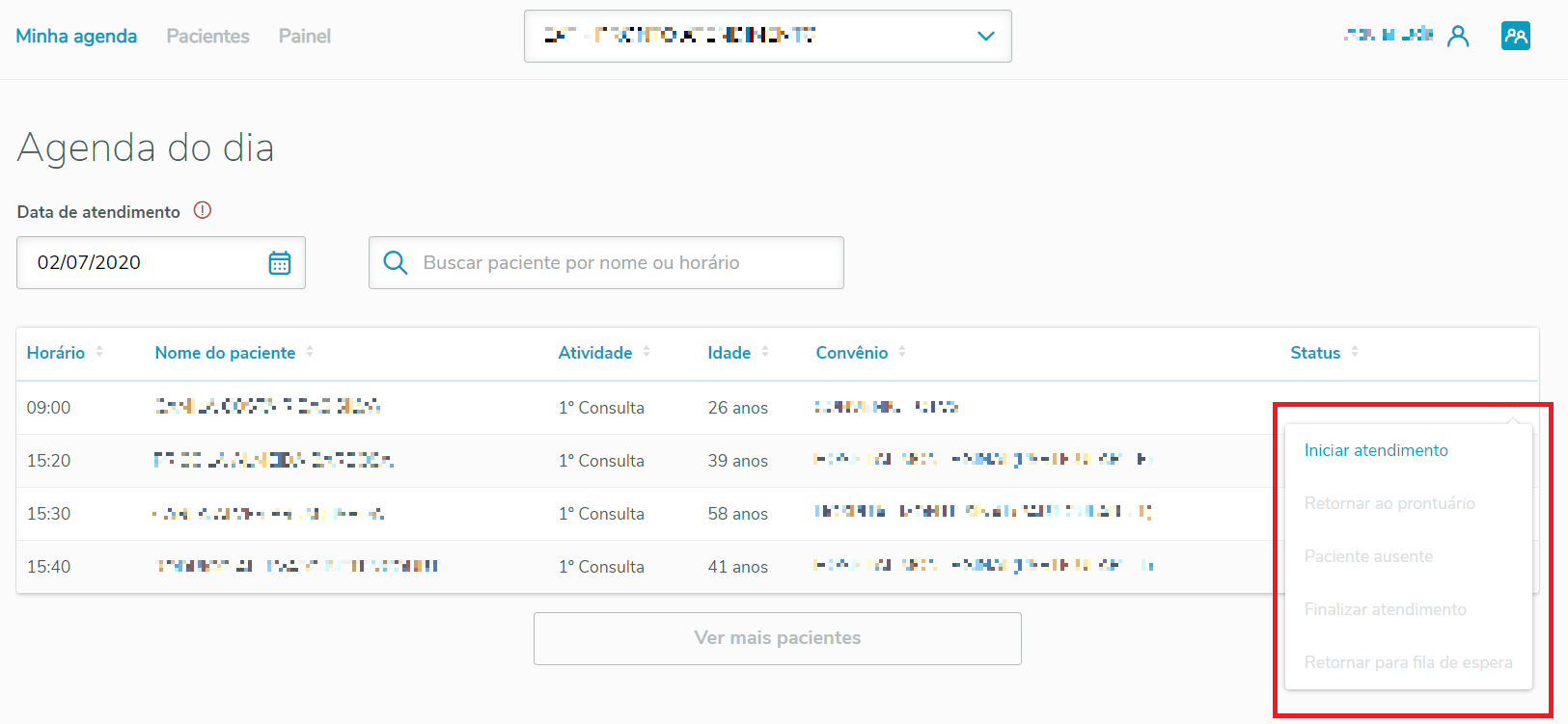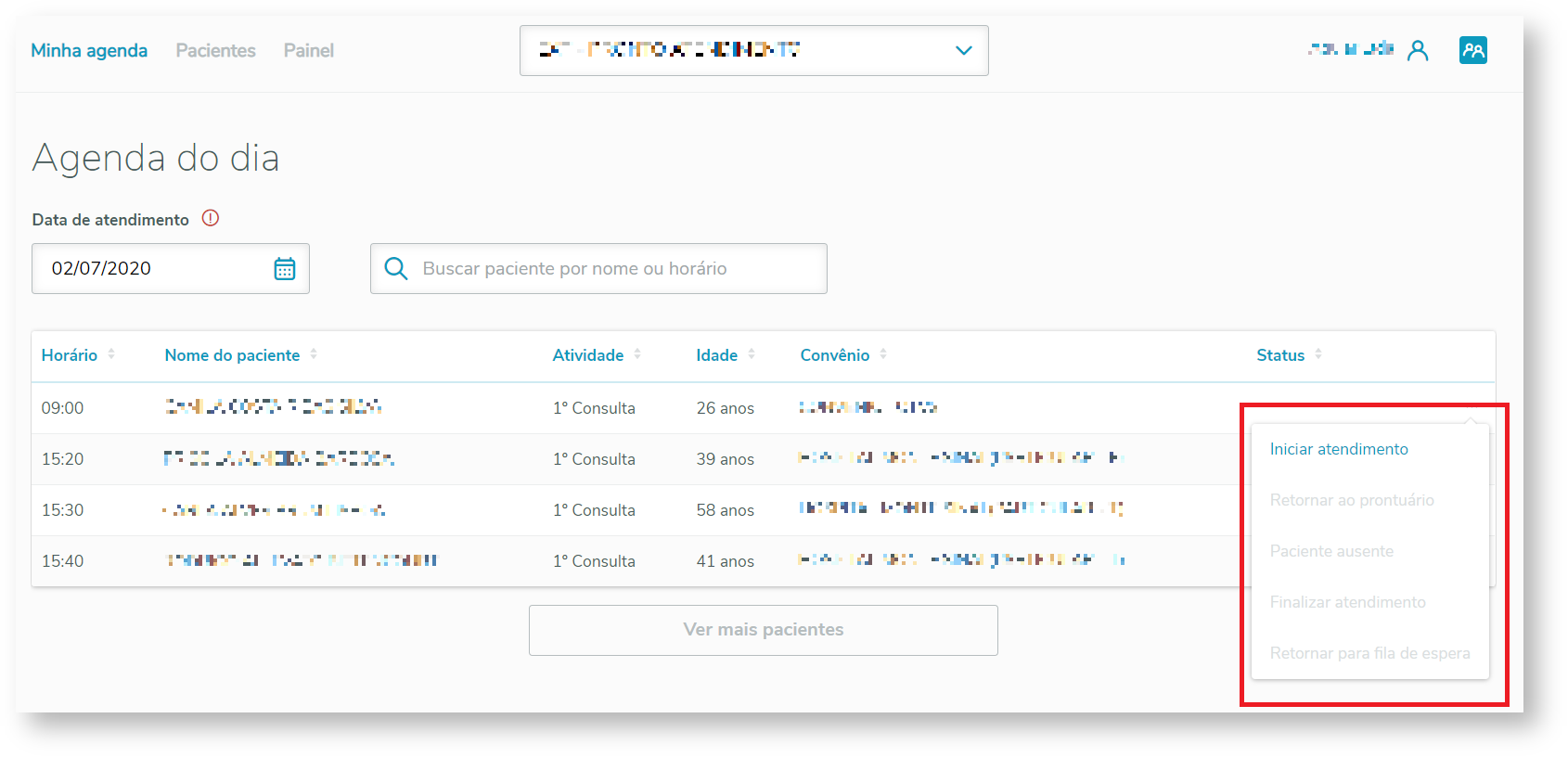 No lado direito da tela, vemos três pontinhos, os quais tem a finalidade de permitir ao médico iniciar um atendimento, retornar ao prontuário do paciente, indicar paciente ausente, finalizar o atendimento e retornar o paciente para a fila de espera. As opções são disponíveis de acordo com o status do paciente na agenda.