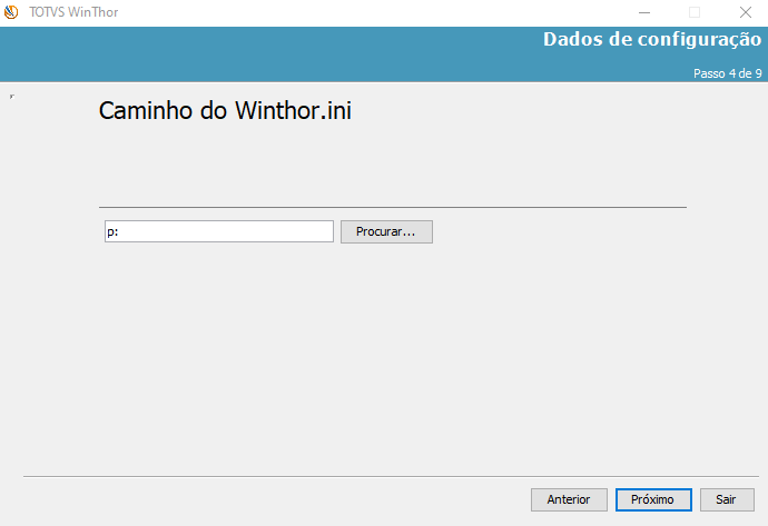 Aqui é um ponto importante, pois você precisa indicar para o instalador qual a pasta onde se encontra o arquivo Winthor.ini. A sugestão dada pela instalação é P: mas depende de cada instalação. Normalmente numa instalação local pode ser c:\Winthor\Prod. O fato é, esse caminho precisa indicar exatamente onde o Winthor.ini se localiza no próprio drive do servidor ou em algum drive mapeado da rede que este servidor tem acesso de leitura. É necessário também configurar a LOJA e EMPRESA para realizar a conexão correta com o banco de dados.