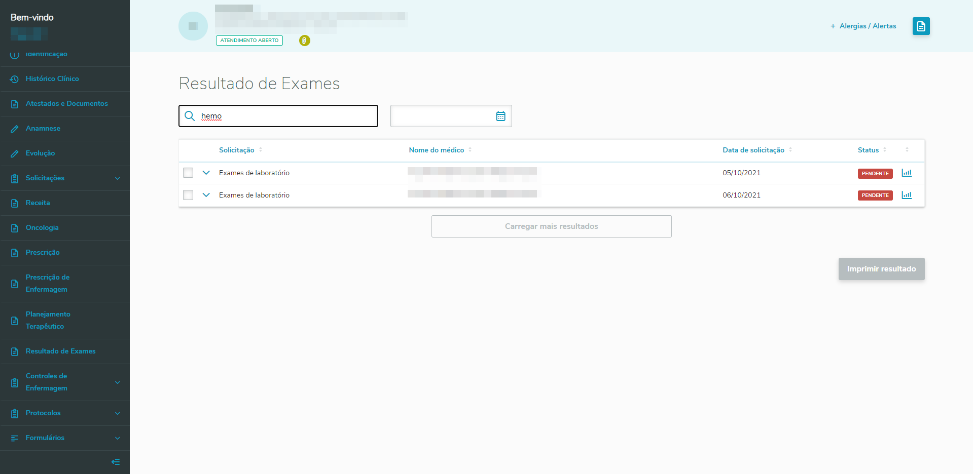 Através do campo de busca é possível filtrar as solicitações por exames. Ex.: Caso o usuário digite a palavra "hemograma", deverão ser listadas apenas as solicitações que possuírem a palavra hemograma em sua lista de exames. Image Removed Image Added
