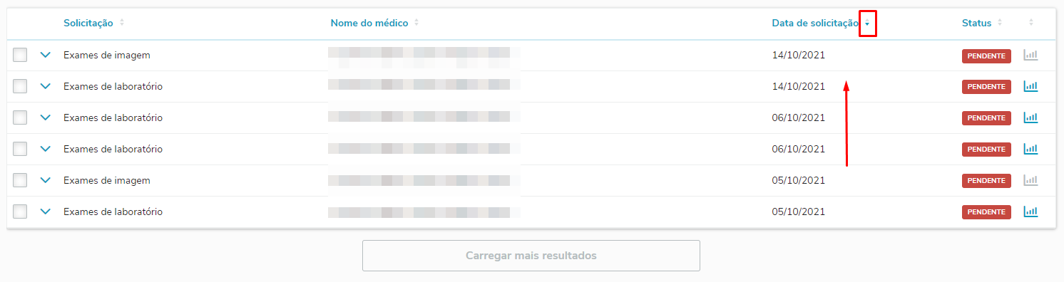 - Status: que poderá ser pendente, reconvocação ou liberado. O valor será liberado apenas quando todos os exames da solicitação estiver com status liberado.
