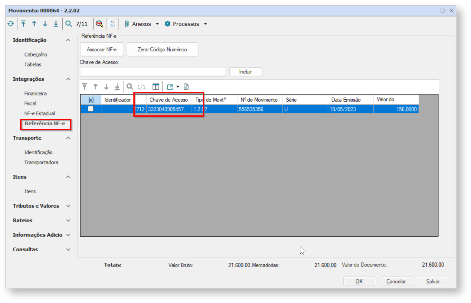 | | Quando a chave de acesso for preenchida manualmente no movimento, ela não será escriturada. |