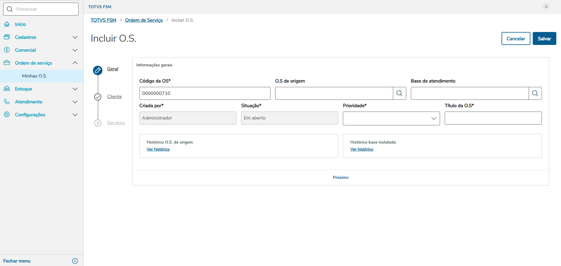 A rotina Ordem de Serviços tem como objetivo realizar a abertura de uma O.S. para realizar os serviços solicitados pelo cliente. Para incluir uma ordem de serviços devemos ter primeiramente um produto e um serviço cadastrado. O cadastro do produto é realizado através da rotina MATA010 e o serviço é cadastrado no FSM. Para cadastrar o serviço acesse este link: FSM0003 - Geração do Serviço no FSM 1 - Aba Geral