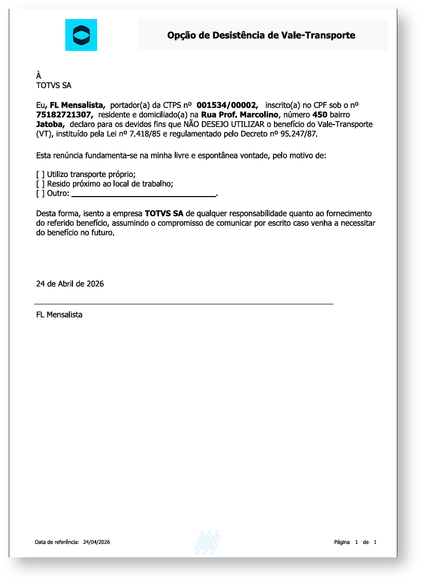 O objeto de negócio Declaração de Opção do Vale Transporte tem como finalidade exibir a intenção de utilização de receber o Vale Transporte.
