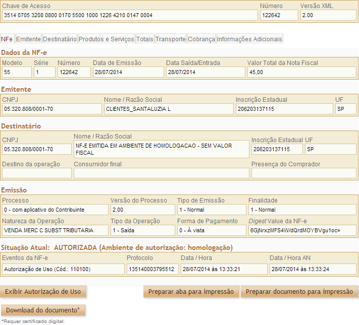 Dessa forma, uma NF-e estar com seu uso autorizado pela Secretaria da Fazenda (SEFAZ) significa simplesmente que a SEFAZ recebeu uma declaração da realização de uma determinada operação comercial, a partir de determinada data e que verificou previamente determinados aspectos formais (autoria, formato e autorização do emitente) daquela declaração, não se responsabilizando, em nenhuma hipótese, pelo aspecto de mérito da mesma que será de inteira responsabilidade do emitente do documento fiscal. Caso na validação sejam detectados erros ou problemas com assinatura digital, formato de campos ou numeração, a NF-e será rejeitada, não sendo, neste caso, gravada no Banco de Dados da SEFAZ. IMPORTANTE: Ao rejeitar uma NF-e, a SEFAZ sempre indicará o motivo da rejeição na forma de códigos de erros e a respectiva mensagem de erro. Esses códigos podem ser consultados no "Manual de Integração do Contribuinte", disponível na seção "Downloads".