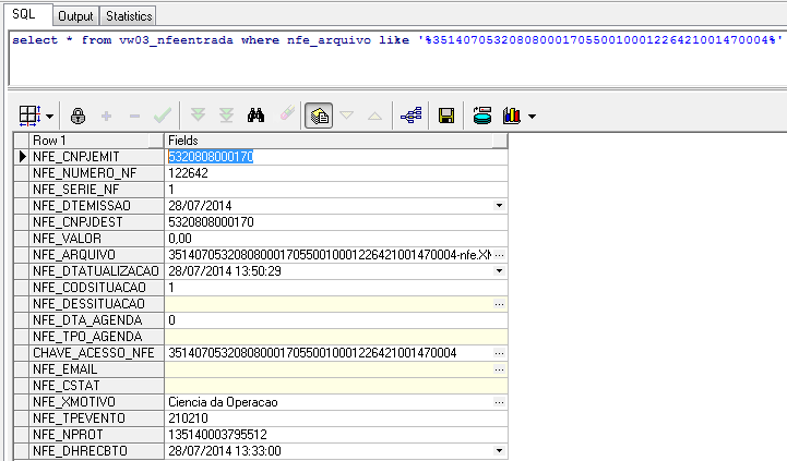 - Imagem da Pesquisa do XML na Tabela vw05_nfexml, podemos ver que o mesmo foi registrado com sucesso.