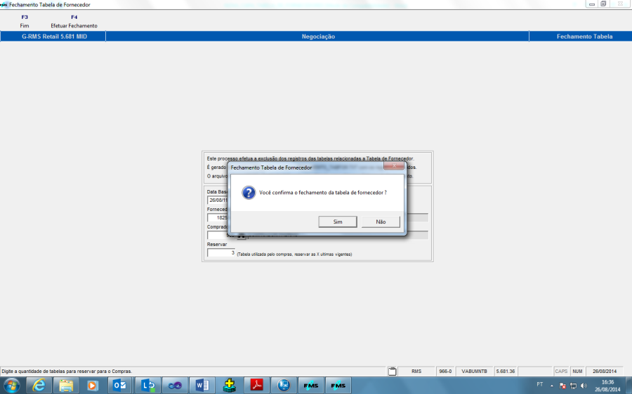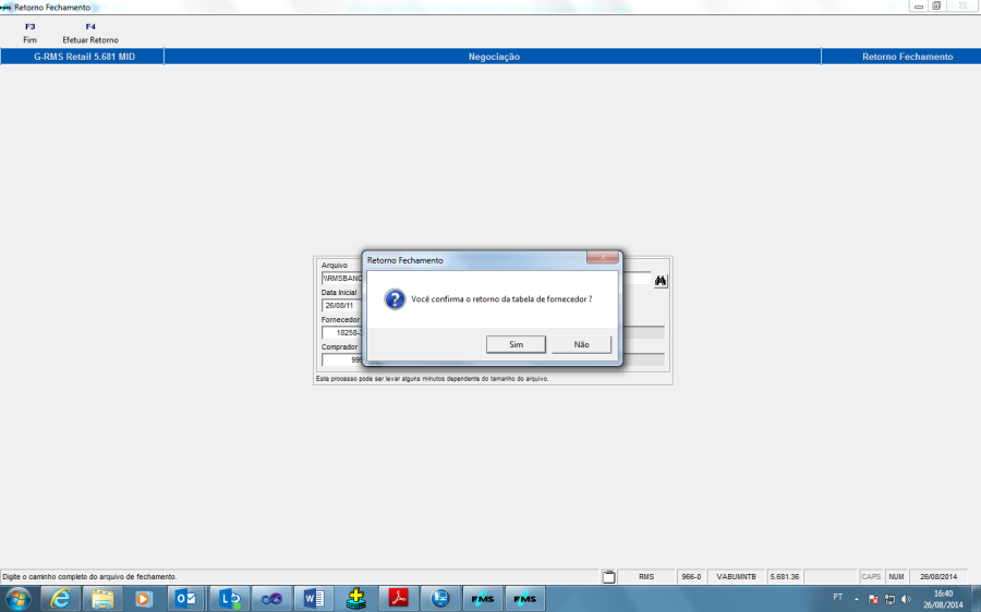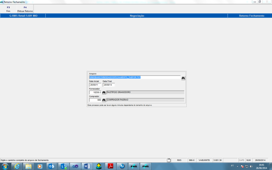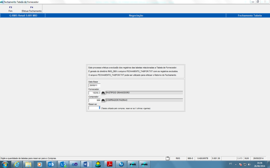 Este processo efetuada o retorno do fechamento ou seja, inclui na Tabela de Fornecedor os registros que foram excluídos do fechamento e armazenados no arquivo "FECHAMENTO_TABFOR.TXT".