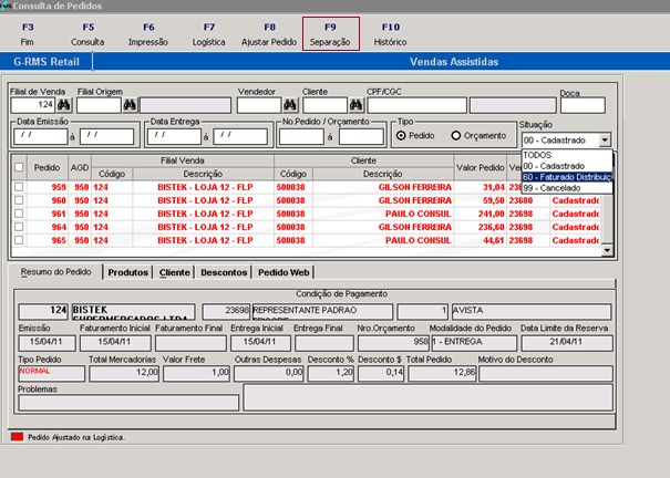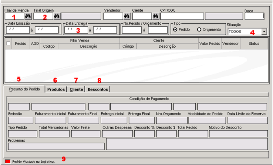 4 | Situação | "Cadastro" – não enviado para logística, "faturado distribuição" – enviado para o modulo de logística, "cancelado" – pedido cancelado, "todos" – exibe os pedidos à revelia da situação. |