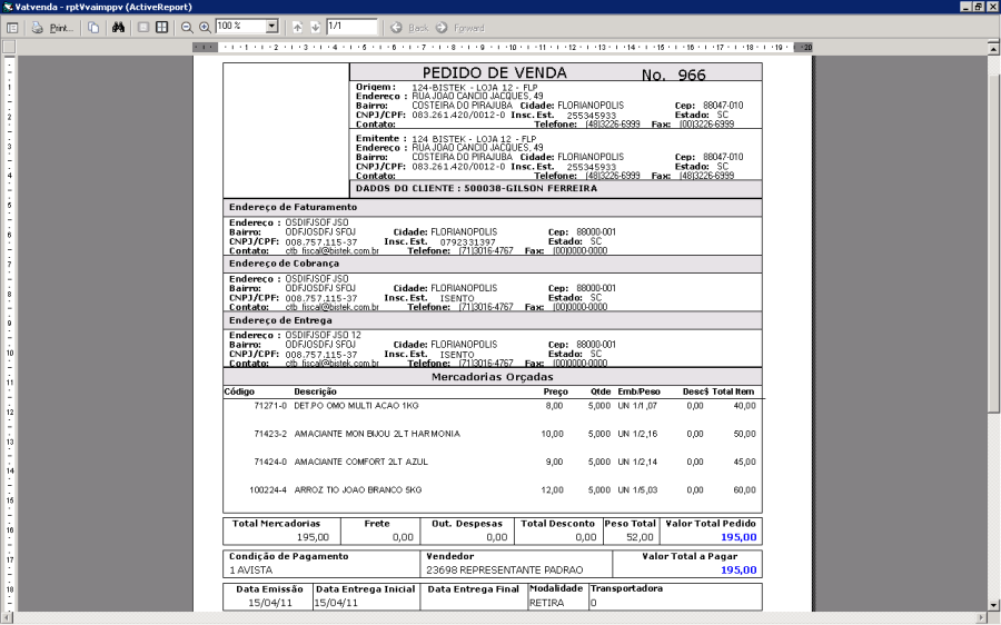 A pasta "Clientes", informa os dados do cliente e o endereço de entrega.