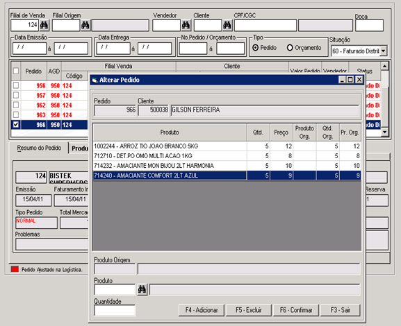 Ao acionar a função F6 LOGISTICA, será enviado o pedido para a distribuição.