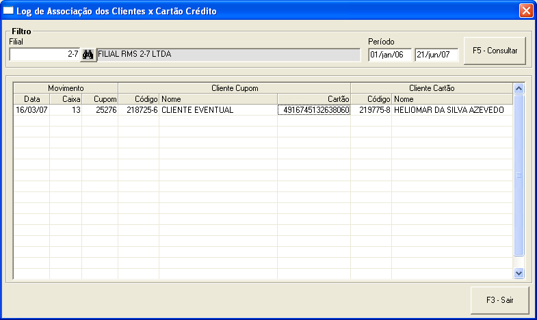 Permite consultar o movimento do cartão dos clientes fidelidade, por filial, por período.