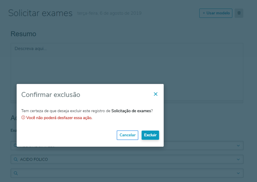 Será exibida uma mensagem de confirmação. Para realizar a exclusão, clique no botão "Excluir".