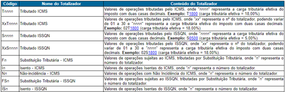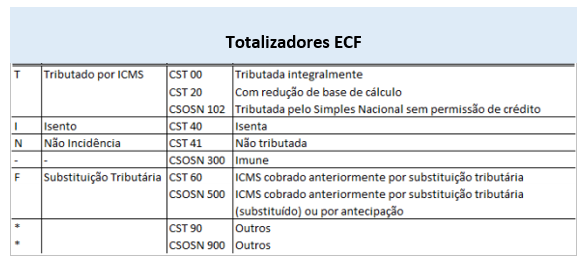 Correlação entre totalizadores previstos no ECF com os códigos de situação tributária e de situação da operação – Regime Normal (CST) e Simples Nacional (CSOSN):