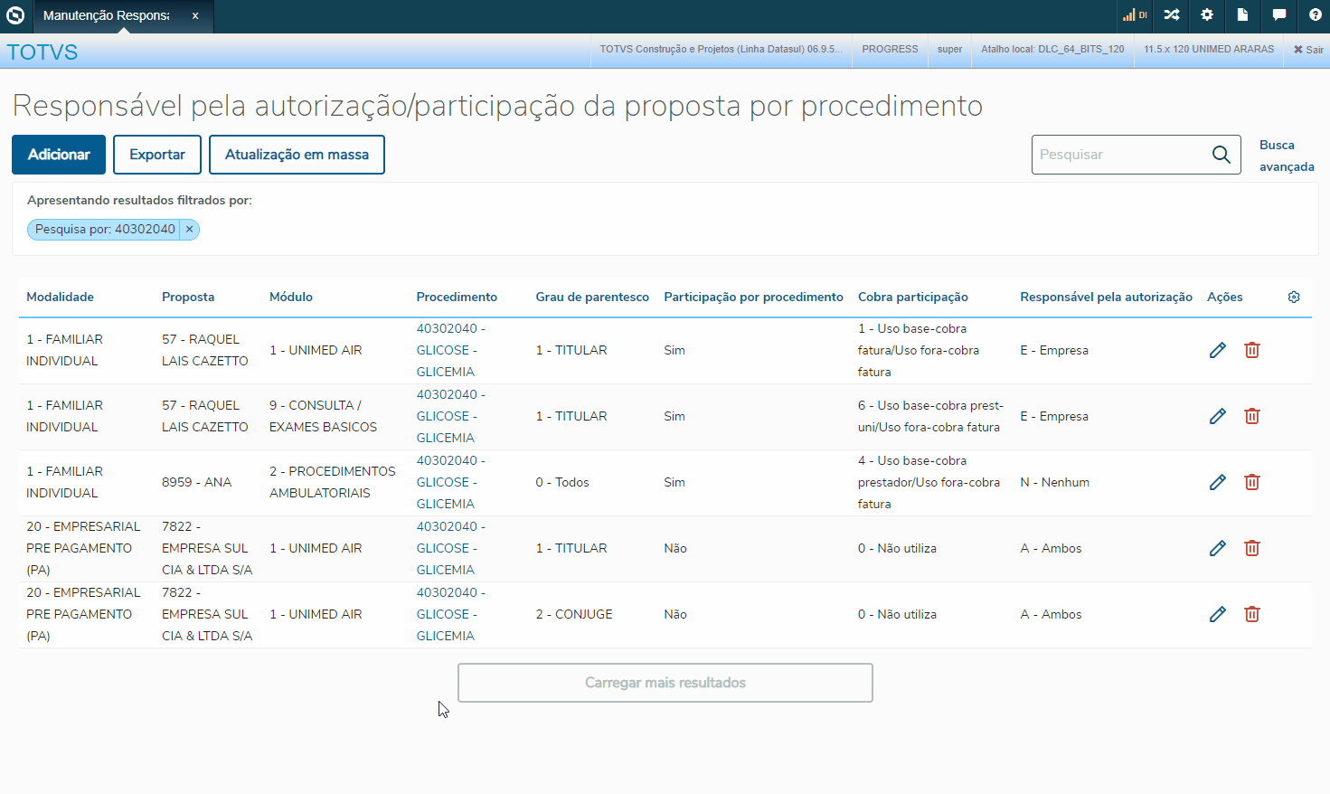 É possível encontrar registros informando parâmetros na caixa de pesquisa. A pesquisa poderá ser realizada através do código da modalidade, código da proposta, código do módulo, código do procedimento e código do grau de parentesco.