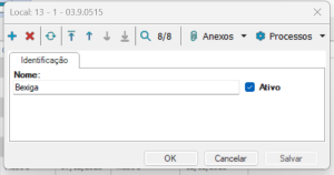- ícone (ou Ctrl+Ins) para incluir, será exibido um modal para descrever o nome do novo local. Após a definição é necessário marcar a checkbox "Ativo" e em seguida clicar em "Salvar" e em "Ok" para finalizar a inclusão.