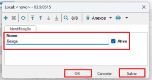 ou Ctrl+Ins) > Descreva o nome do local > Clique em "Salvar" e "Ok" para finalizar a inclusão.