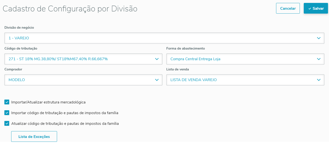 - Importar/Atualizar estrutura mercadológica: Indica se importa/atualiza a estrutura mercadológica (Categorias), na referida divisão.
