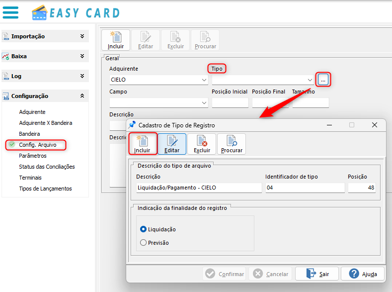 Para a Configuração de Arquivo, devemos selecionar o botão "Incluir": 1.- Informe o Adquirente desejado que foi criando nos primeiros passos 2.- Em seguida, selecione um "Tipo" de registro desejado.