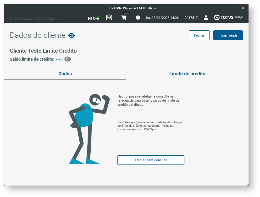 Exemplo de uma consulta de limite de crédito onde houve um erro de comunicação, permitindo efetuar uma nova consulta.