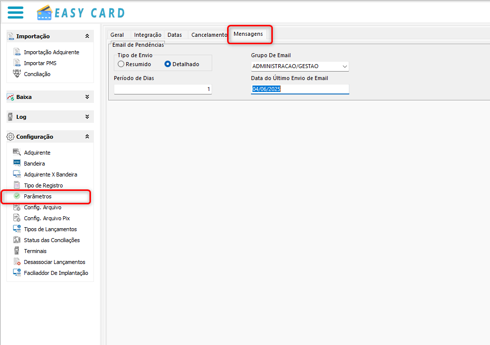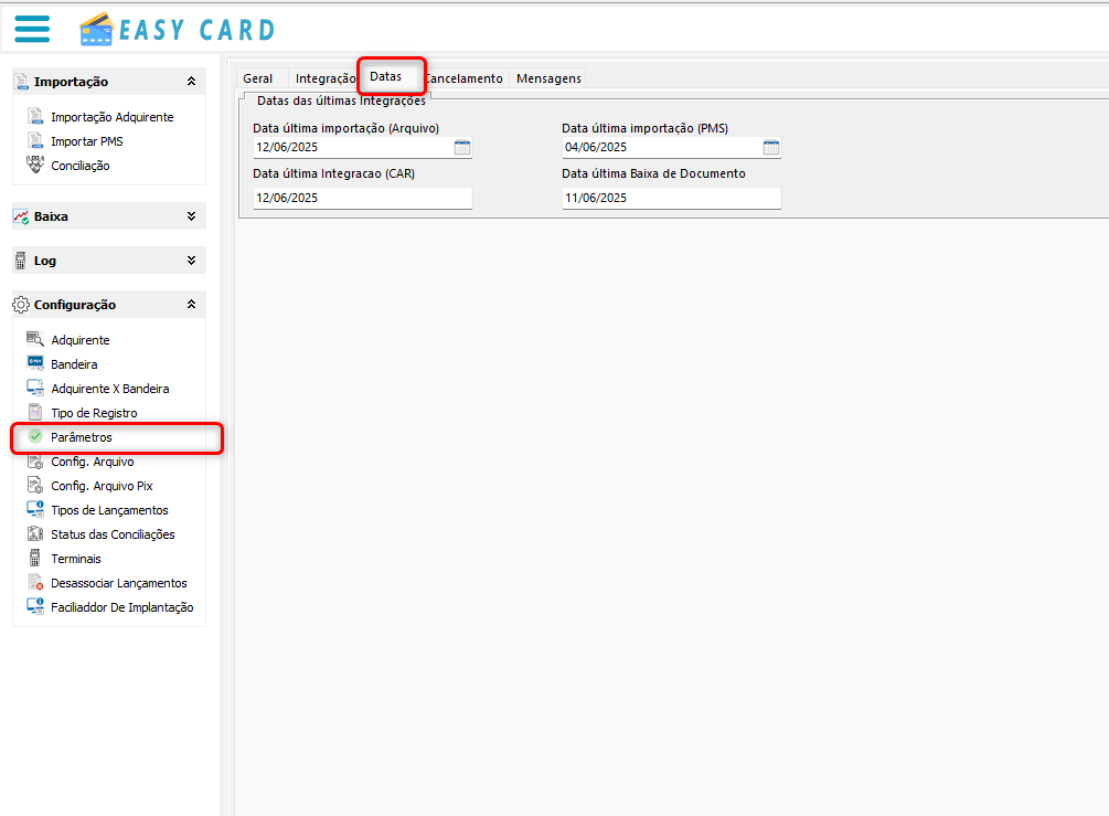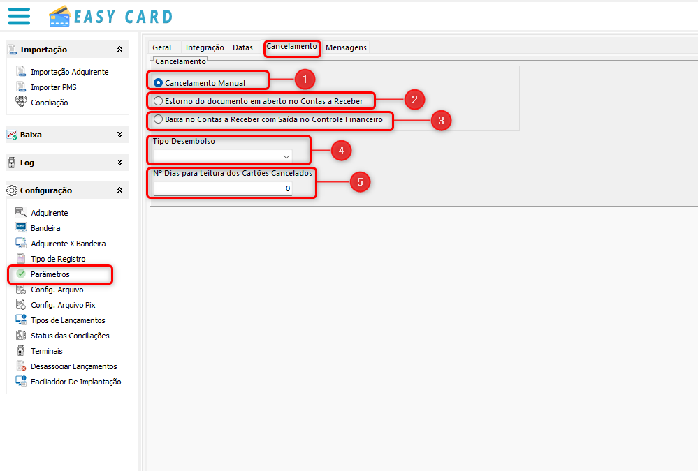 5 - Número de dias para Leitura dos Cartões Cancelados, este valor é para realizar buscas retroativas a data atual, pois em alguns cenário o cancelamento de parcelas podem ocorrer até em 30 dias.