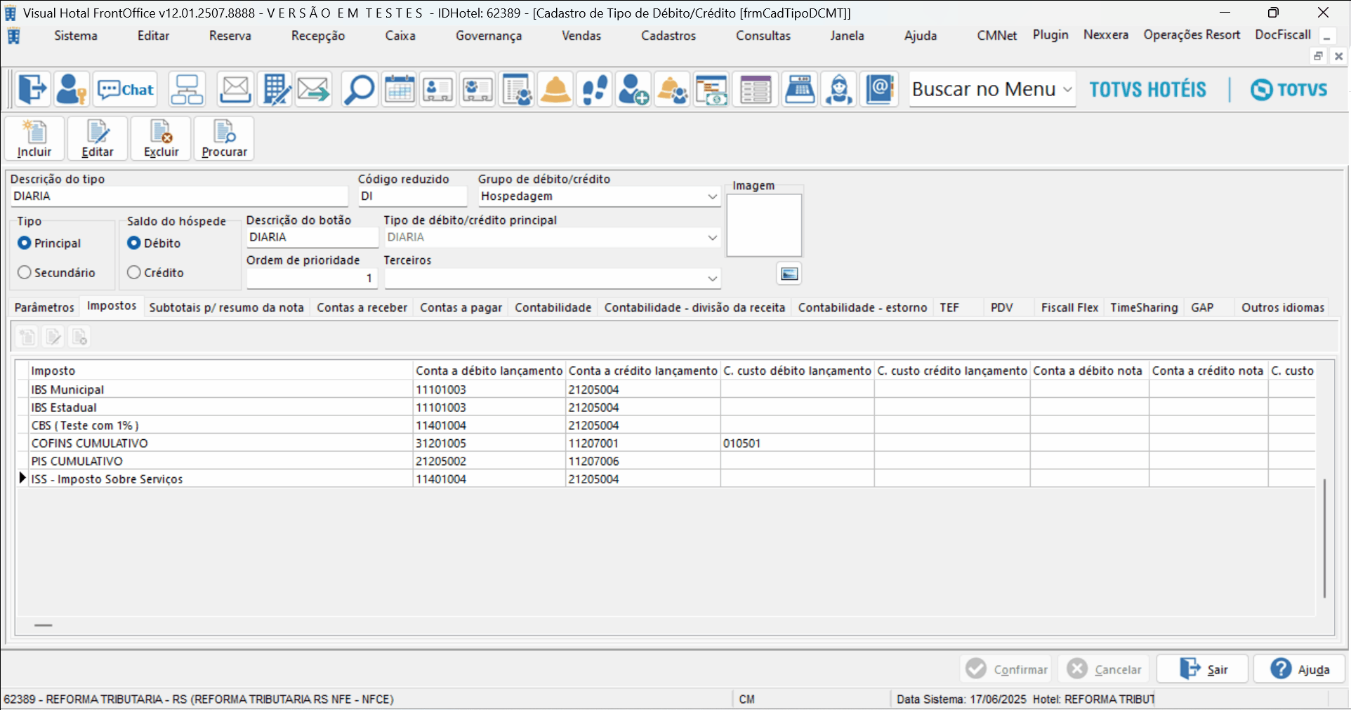A tela a seguir , apresenta as configurações para lançamento do lançamento com imposto em separado. Considerar Considere o exemplo acima de , referente a um lançamento de diária. Na aba impostos, campo"Impostos":