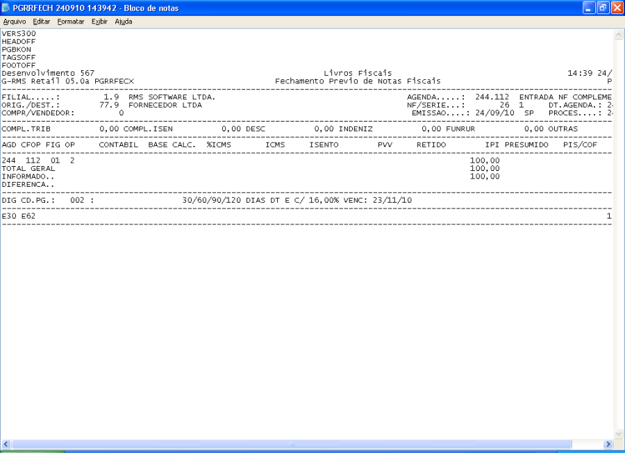 Livro Fiscal de Entrada da Nota Fiscal Complementar