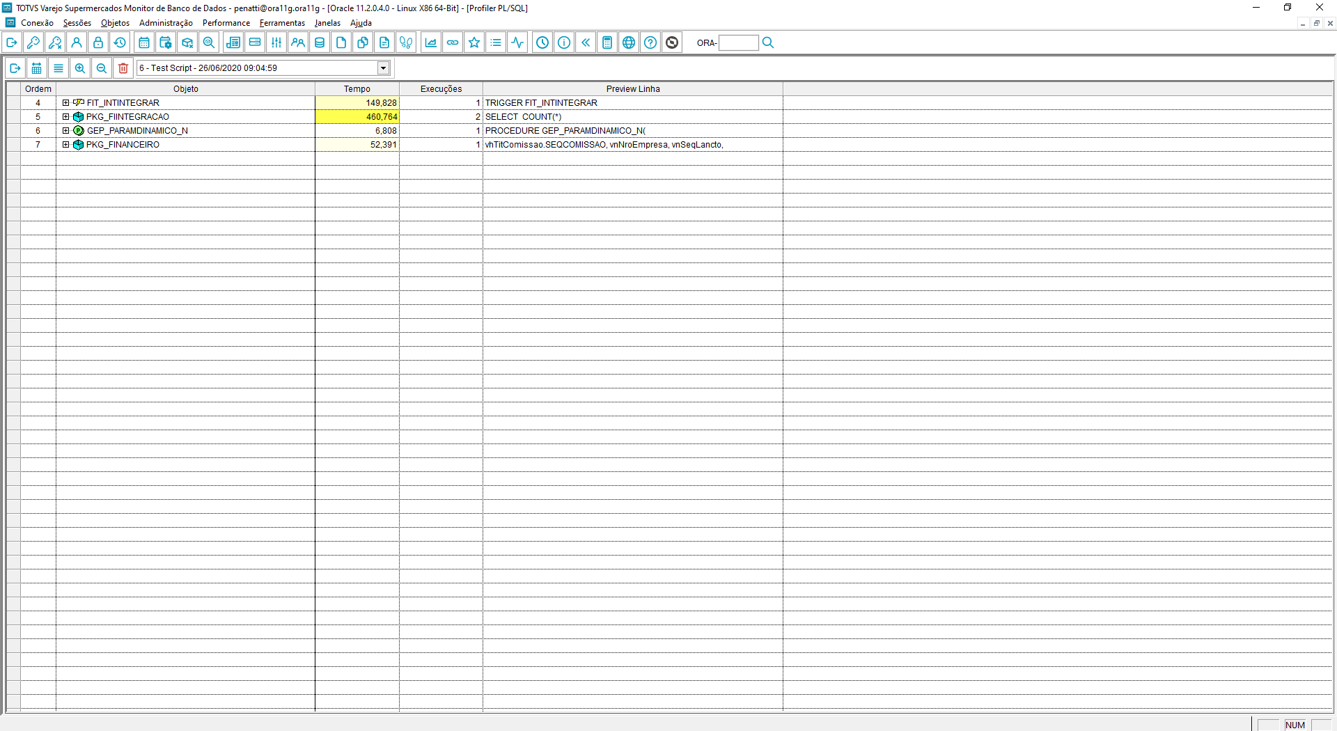 Exibe de forma hierárquica o resultado dos profiles PL/SQL gerados, destacando em amarelo as linhas de código com maior tempo de execução.