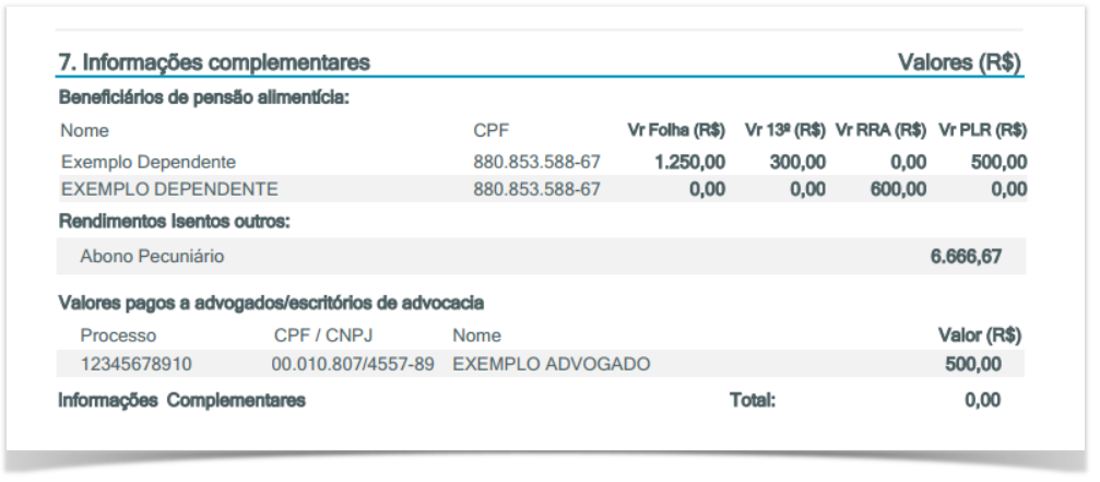 - Detalhamento da pensão sobre folha/férias, 13º salário, férias, PLR e RRA no campo 7 (Informações Complementares), conforme demostrado abaixo: