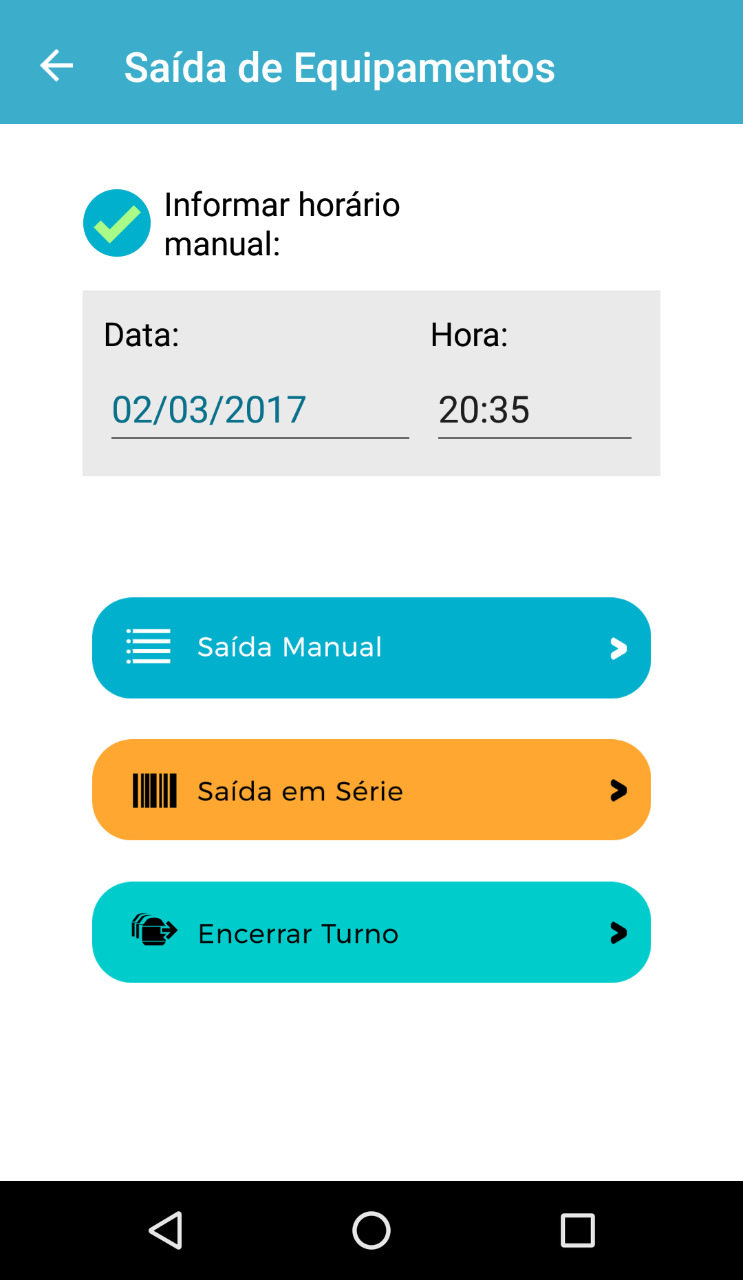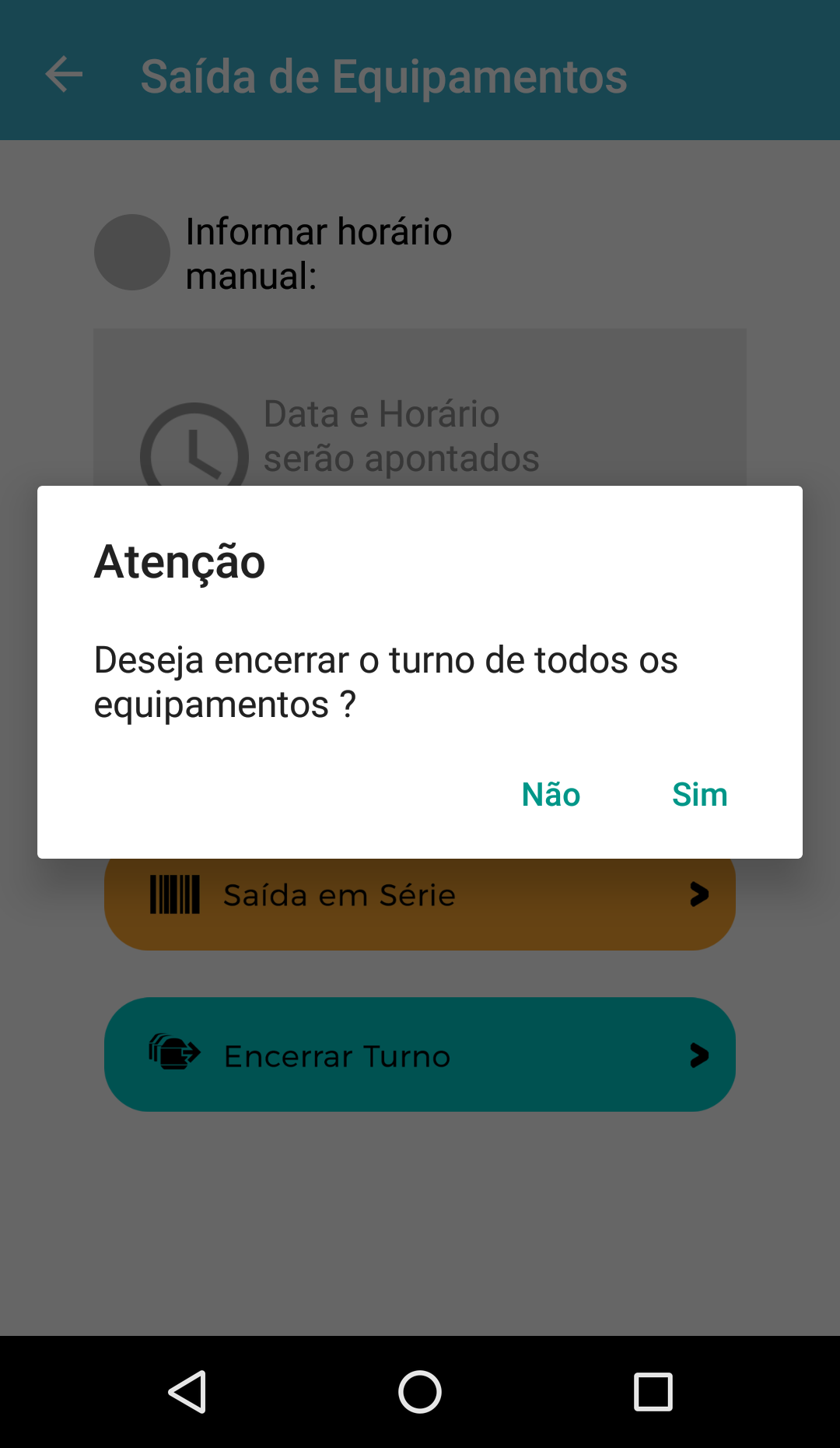 | Validação da Data: Assim como nas opções de entrada, a data final do apontamento deve estar dentro do intervalo do projeto no qual foi definido no cronograma. | Saída Manual: Nessa tela são exibidos os apontamentos pendentes de fechamento para que possam ser encerrados com a informação da data final. | Saída em Série: A opção de saída em série possibilita a leitura de códigos de barra em sequência, onde para cada equipamento apontamento é encerrado. | Encerrar Turno: Com essa opção é possível encerrar todos os apontamentos pendentes de uma só vez. |