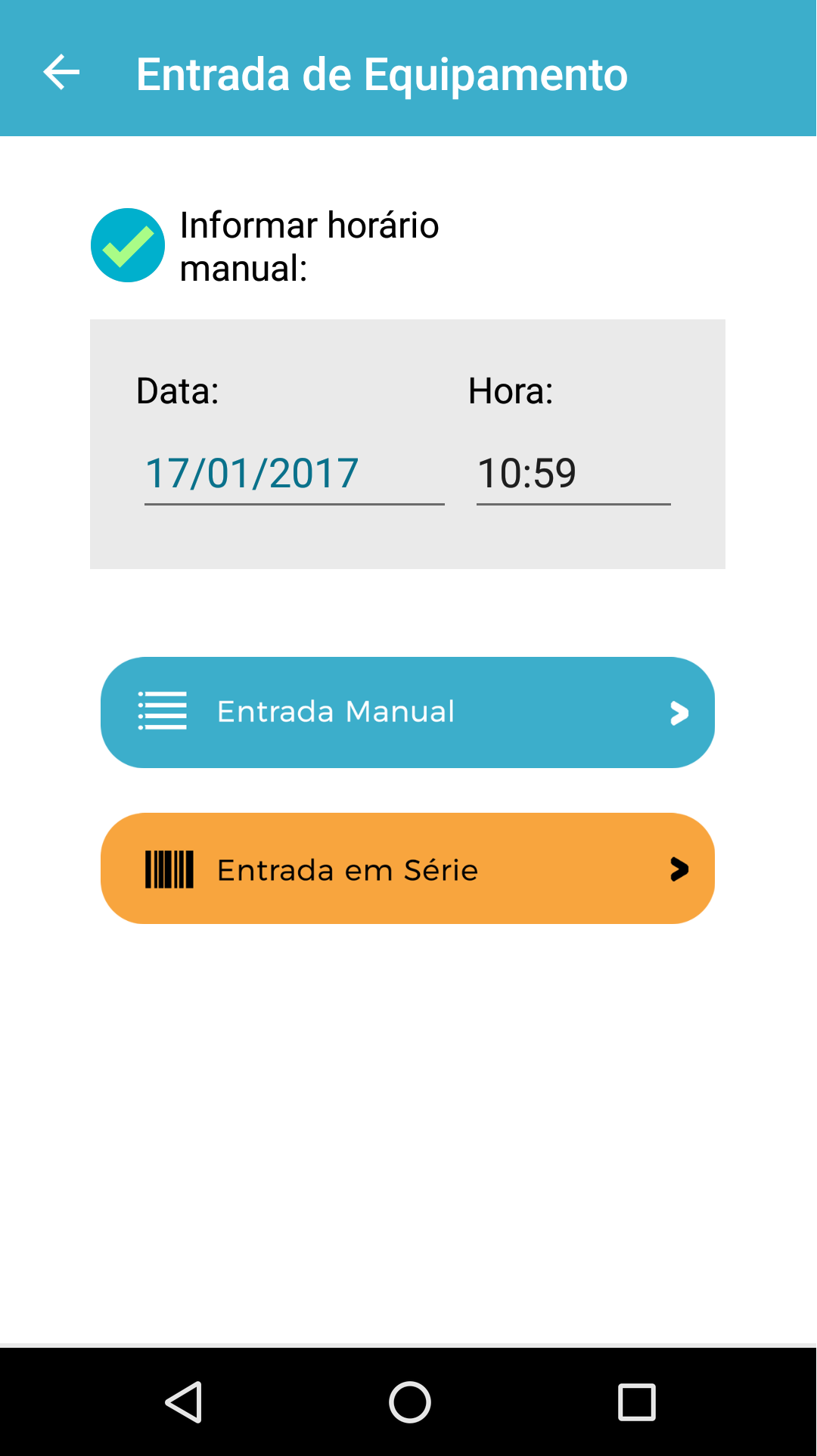 | Entrada e Saída de Equipamento: Para o apontamento de Equipamento é necessário o registro da entrada e saída para que o mesmo possa ser sincronizado. | Opções de Entrada: A data e hora de início do apontamento podem ser definidas manualmente ou utilizada a do coletor. Os apontamentos podem ser inseridos por equipamentos manualmente ou através da leitura do código de barras (entrada em série). | Validação da Data: A data de início do apontamento deve estar dentro do intervalo do projeto no qual foi definido no cronograma. | Equipamentos do Usuário: Quando o usuário é um operador de equipamentos, a selecionar a opção de Entrada Manual para o apontamento, a tela de equipamentos do usuário é exibida para que o equipamento possa ser pré-selecionado para a inclusão do apontamento. |