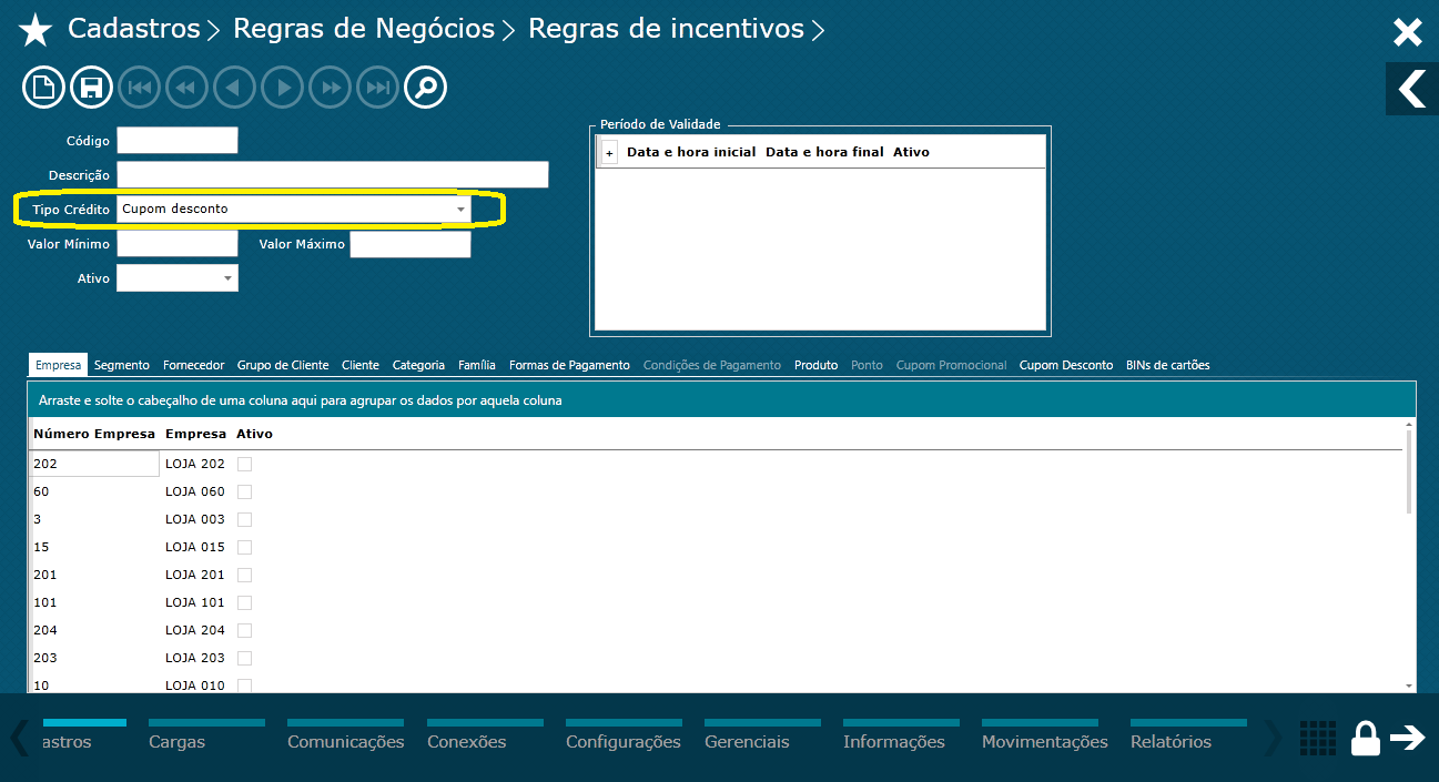 Dica: Como Como informado anteriormente, o cupom desconto será inserido na regra que está vinculado a regra de incentivo.