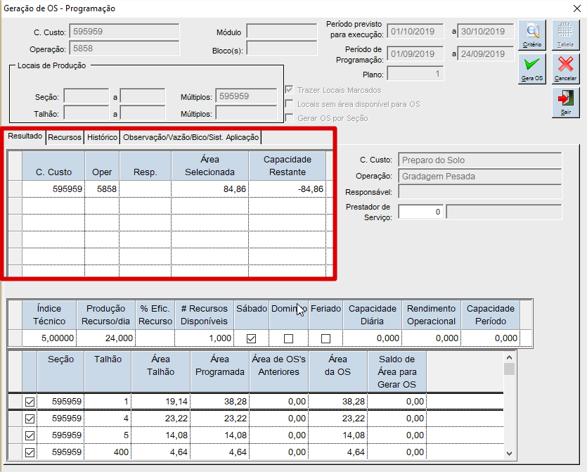 Na aba Resultado são recuperados centro de custo/ operação, também disponibiliza o campo Responsável para poder informar o responsável que irá realizar a OS, além de mostra o total de área produtiva dos locais selecionados