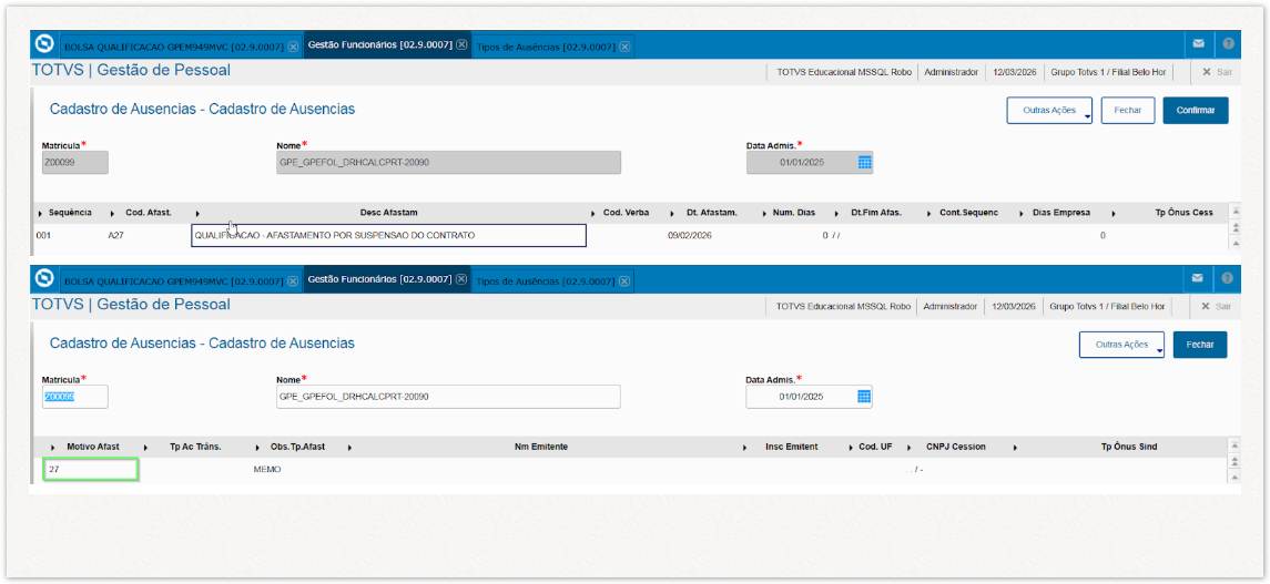 Cadastrar um tipo de afastamento pelo menu Atualizações>Definições de Cálculos>Tipo de Ausências, utilizando o Motivo eSocial (RCM_TPEFD)= 27 - Qualificação - Afastamento por suspensão do contrato de acordo com o art 476-A da CLT: Acesse a rotina para lançar o afastamento, Atualizações>Funcionário>Cadastro de Ausências: |