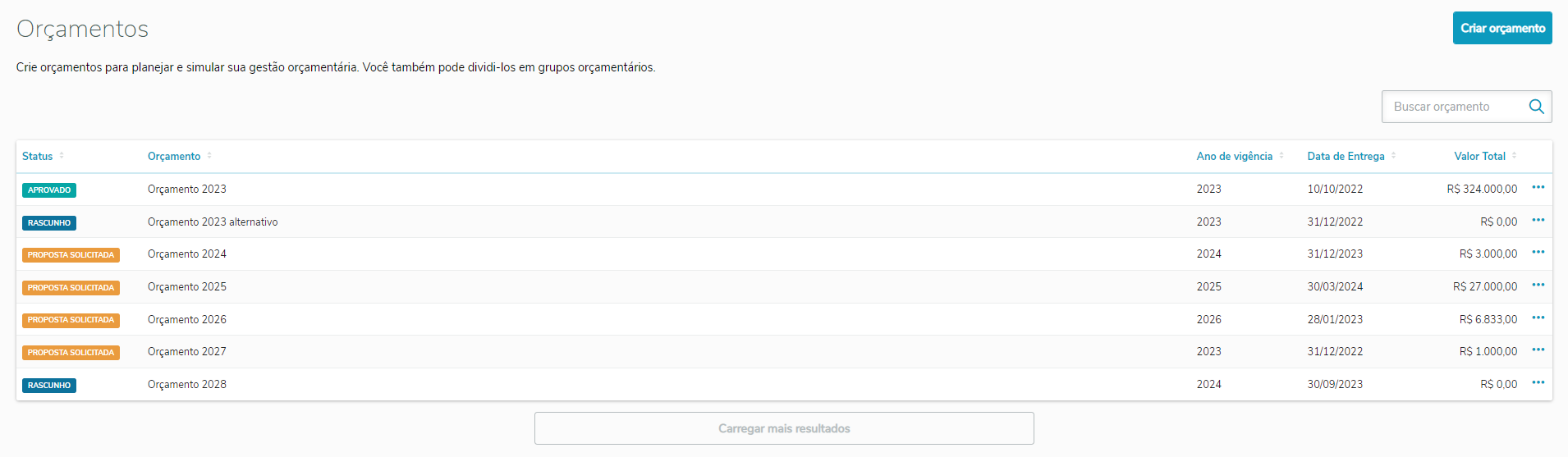 Na tela de orçamento empresarial, é possível visualizar uma lista de todos os orçamentos cadastrados e ativos. Para criar um novo orçamento, clique em Novo orçamento.