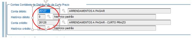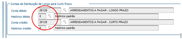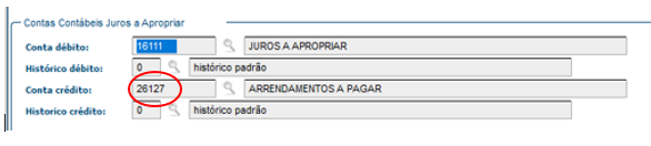 - Neste campo normalmente será informada a conta de arrendamentos a pagar (Passivo). Caso esteja sendo efetuada a distribuição entre Curto e Longo Prazo, aqui será informada a conta de arrendamentos a pagar do curto prazojuros recebidos (Resultado).