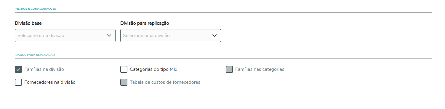 Familias nas categorias: indica se deve replicar as Familias nas categorias da divisão base. Apenas disponível caso o campo Categorias do tipo Mix esteja selecionado.