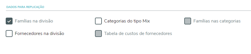 Categorias do tipo Mix: indica se deve replicar as categorias do tipo Mix da divisão base. Caso a Divisão para replicação possua alguma categoria do tipo Mix cadastrada essa opção será desativada.