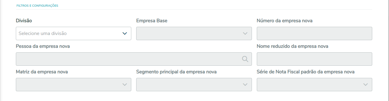 é obrigatório. Divisão: lista de divisões cadastradas no ERP, todos os campos ficam bloqueados até que uma divisão seja selecionada. Empresa Base: lista de empresas ativas e pertencentes à divisão selecionada anteriormente. Número da empresa nova: valor numérico da nova empresa. Número da empresa PDV: valor numérico da nova empresa PDV (Campo só habilita se valor do campo 'Número da empresa nova' for maior de 3 dígitos). Pessoa da empresa nova: pessoa para a nova empresa. Nome reduzido da empresa nova: descrição de nome reduzido da nova empresa. |