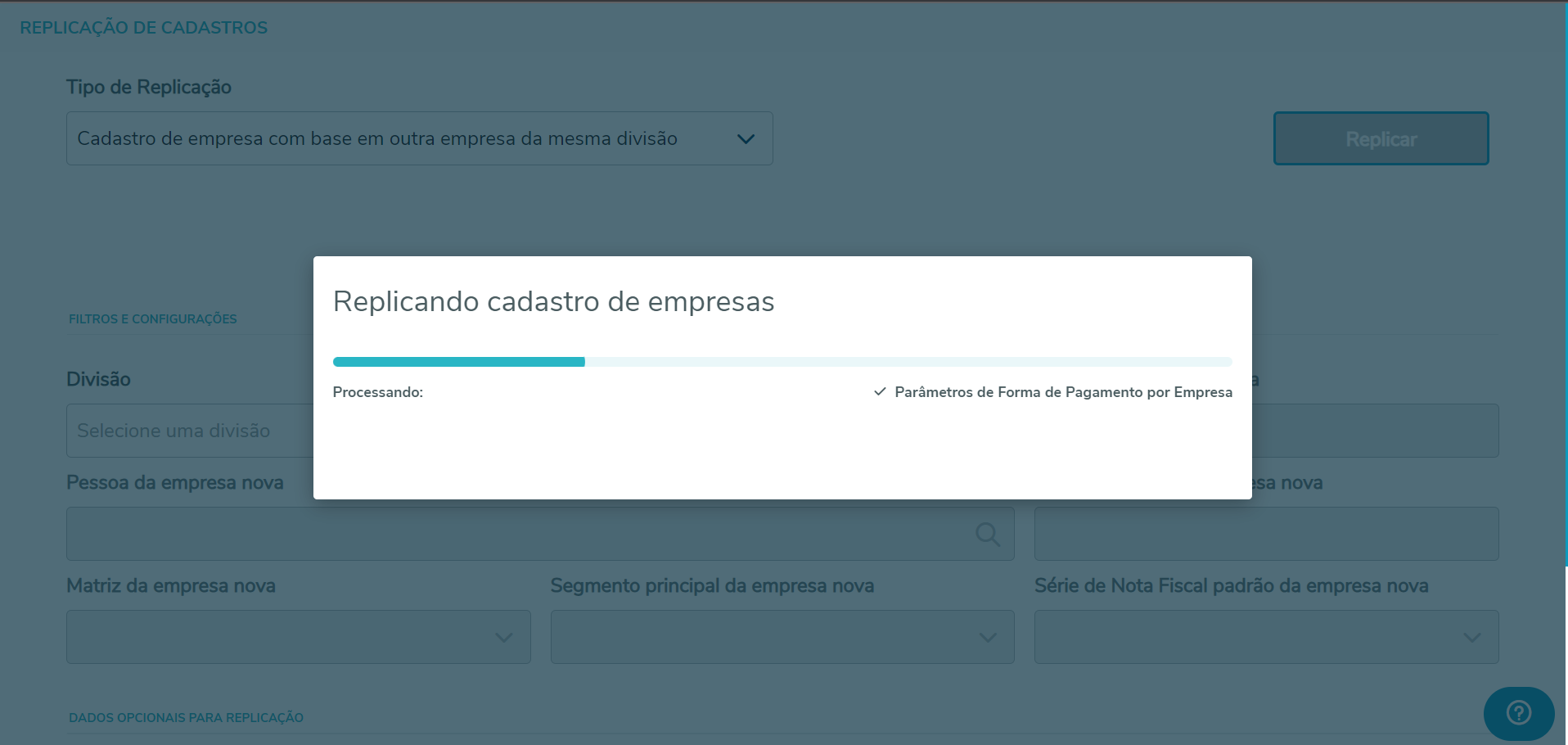 No Tipo de replicação, selecione "Cadastro de empresa com base em outra empresa da mesma divisão".