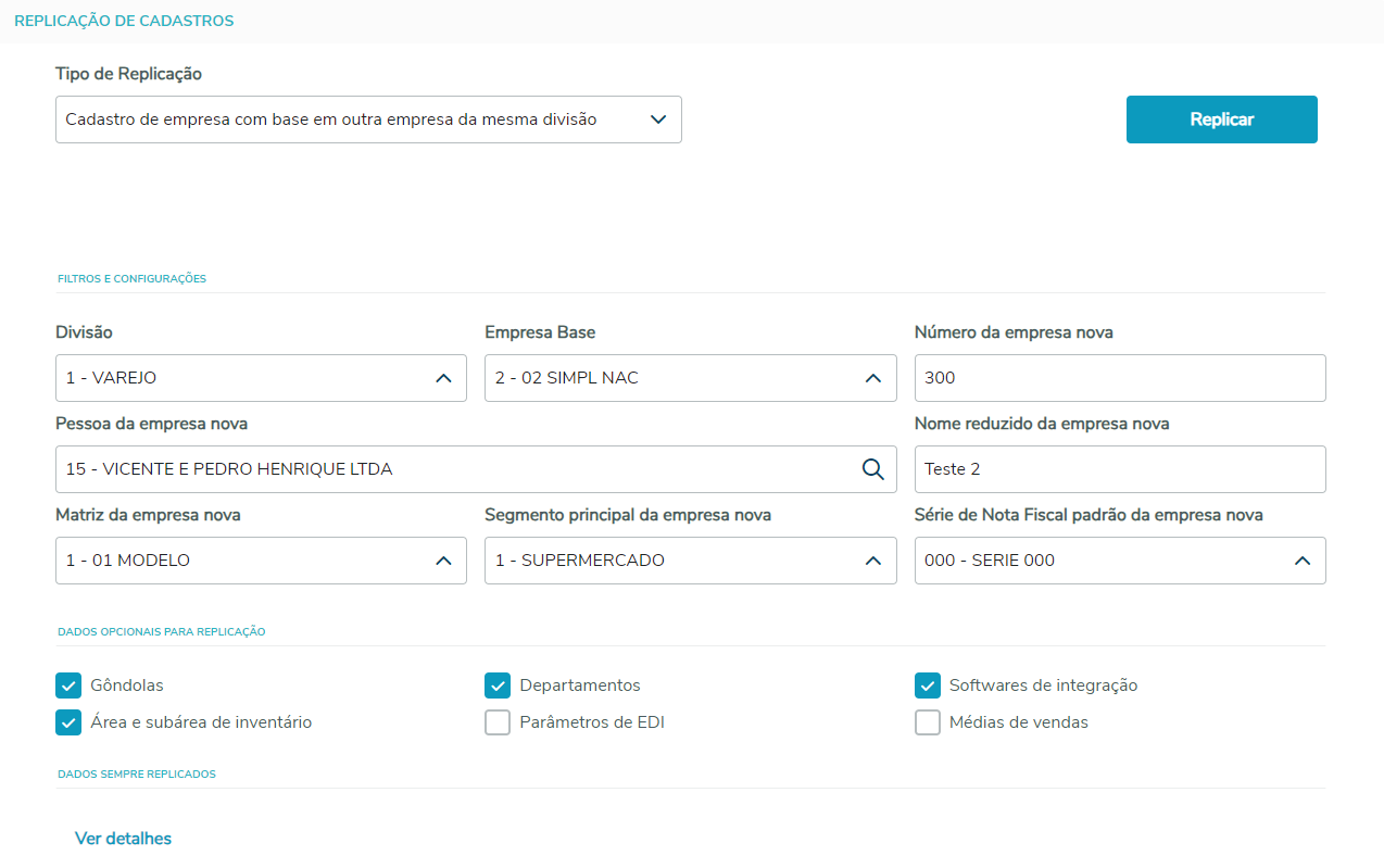 Imagem 04 - Tela destacando Ver Detalhes para que seja exibida a lista de cadastros que sempre são replicados. Replicação de Cadastros Após o preenchimento dos campos obrigatórios, o botão Replicar é habilitado |
