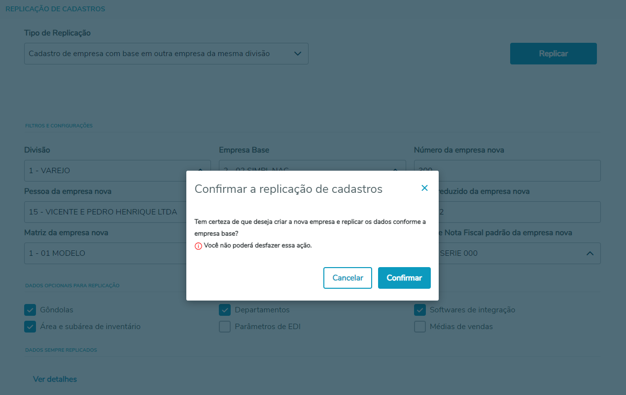 Imagem 05 - Tela preenchida da Replicação de Cadastros. Clique em Confirmar eo processo de replicação |