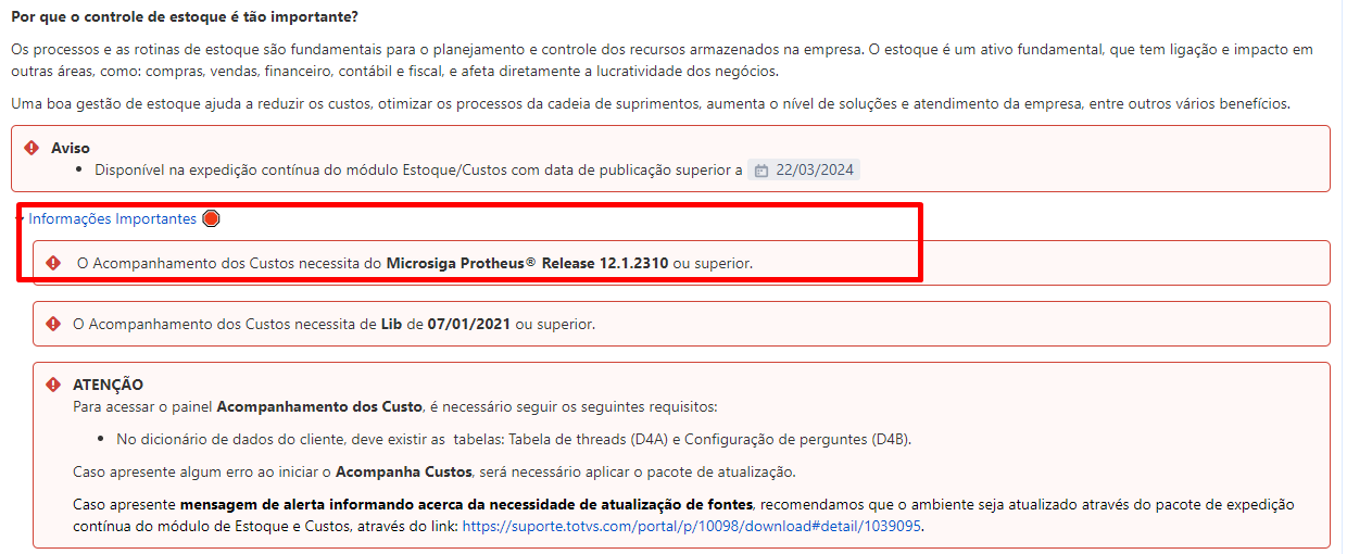 "Verificamos que há rotinas desatualizadas no seu ambiente. Aplique o último acumulado do módulo de estoque e Custos para acessar a funcionalidade"
