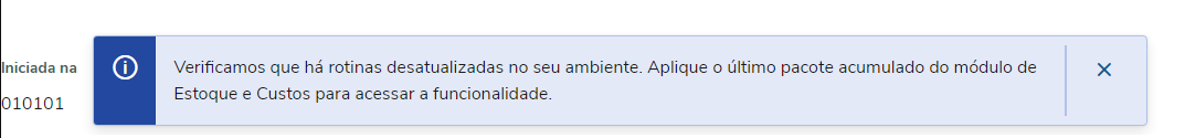 OCORRÊNCIA 21 - Ao clicar na aba de acompanhamento de Custo Kardex apresenta a seguinte mensagem: "Verificamos que há rotinas desatualizadas no seu ambiente. Aplique o último acumulado do módulo de estoque e Custos para acessar a funcionalidade"