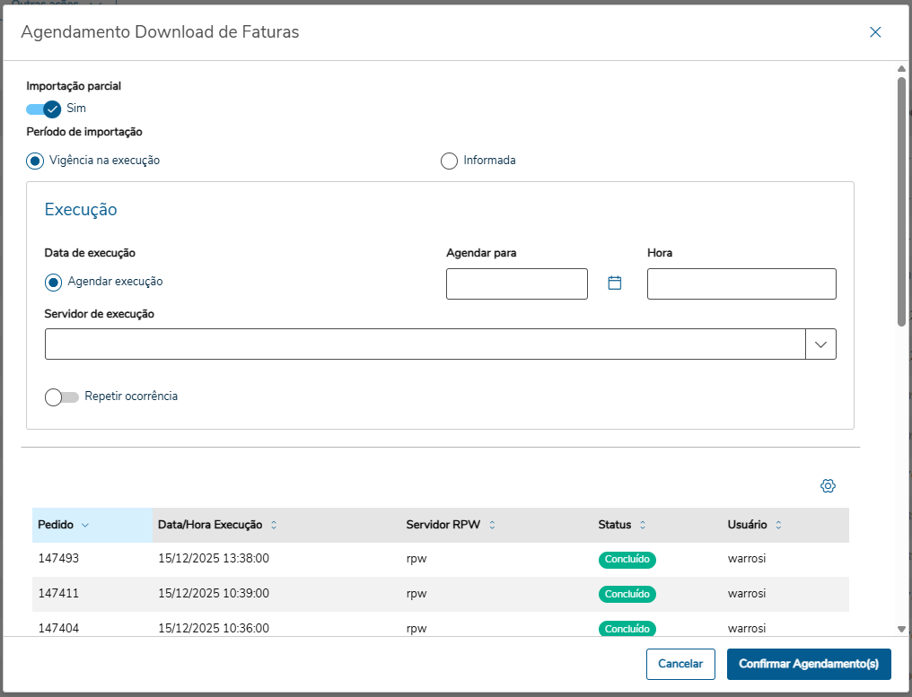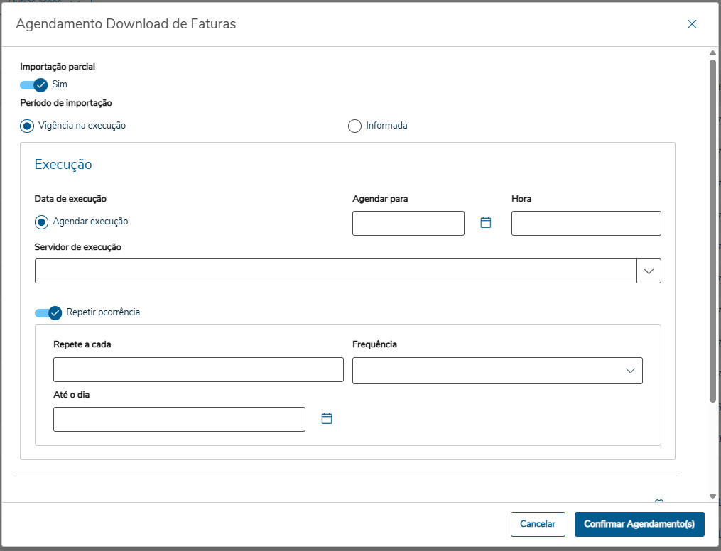 | Data de execução | Agendar execução - deverá ser definido um período para importação. Habilita os campos Agendar para e Hora. |