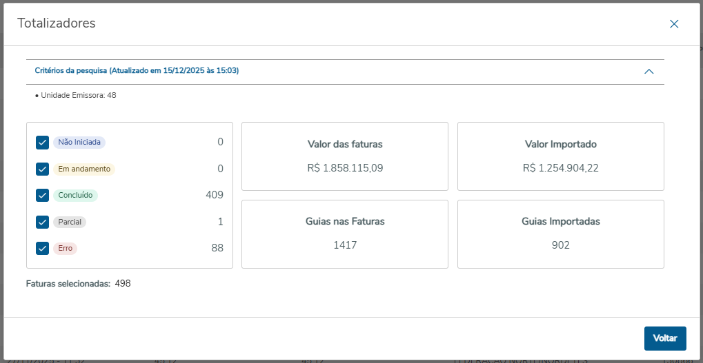 Faturas selecionadas | Número de faturas da pesquisa e conforme status selecionados. |