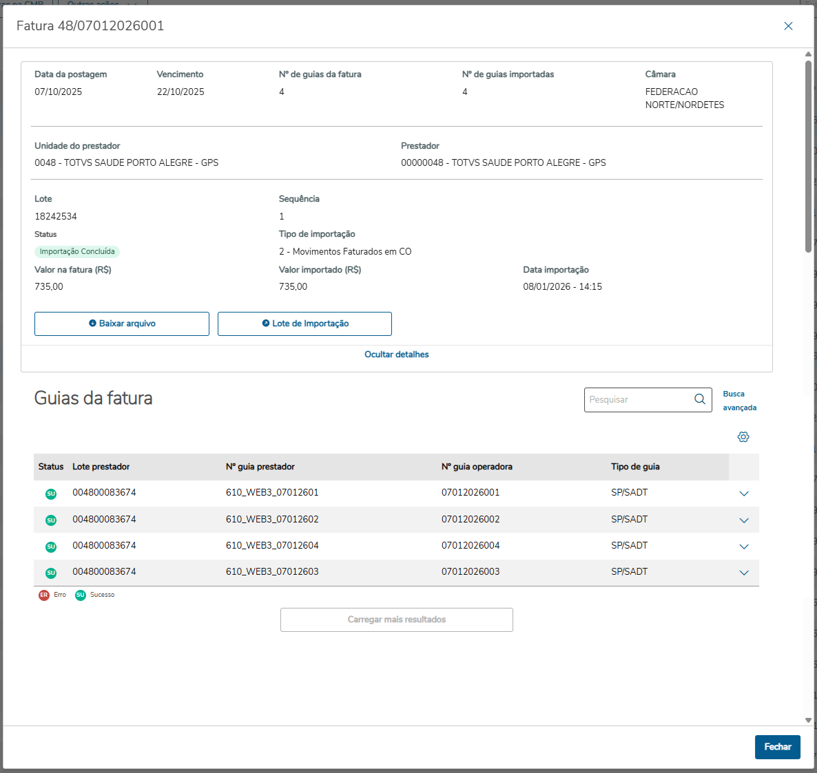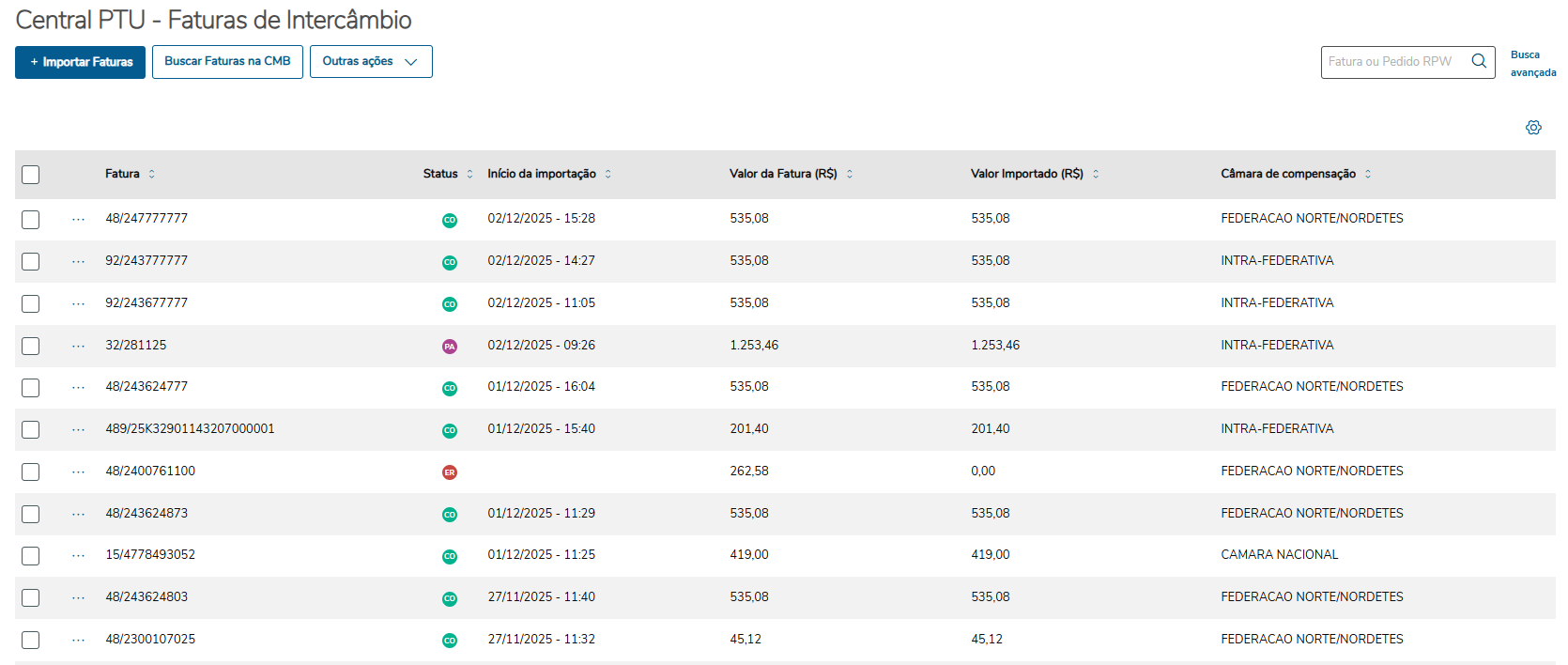| Visualizar | Visualiza os dados completos da fatura. (Apenas faturas com status de "Concluído", "Parcial" e "Erro" quando existir um lote de importação) |