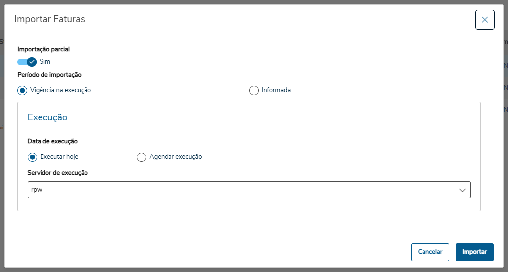 | Servidor de execução | Servidor RPW que será utilizado para realizar a importação. |