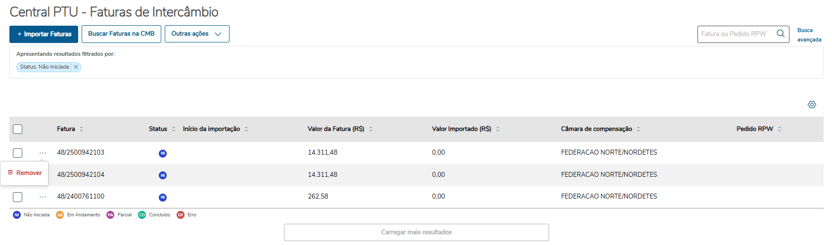 | Remover | Realiza a remoção de registros. (Apenas registros com status de "Não Iniciada" e "Erro" quando não tiverem lotes de importação) |