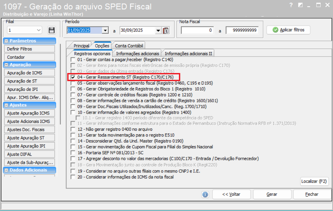 Foi alterada a geração do registro C176 no Sped Fiscal para quando estiver marcado o parâmetro “04 - Gerar Ressarcimento ST (Registro C170/C176)” e o produto possuir CFOP = 5927 conforme requisito.