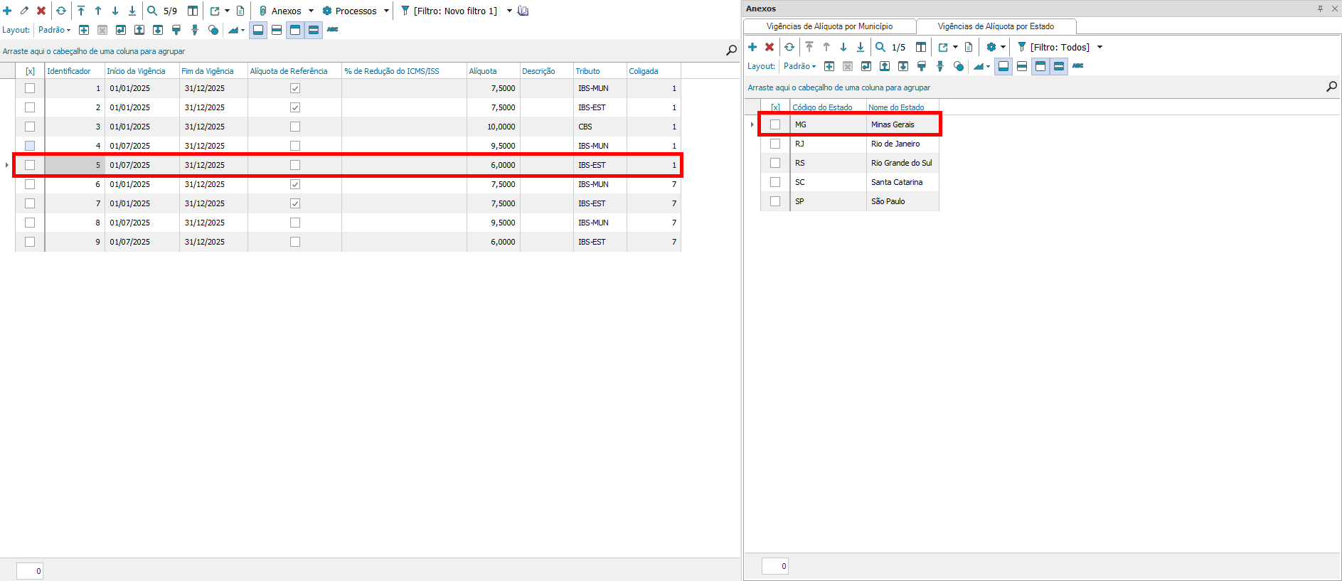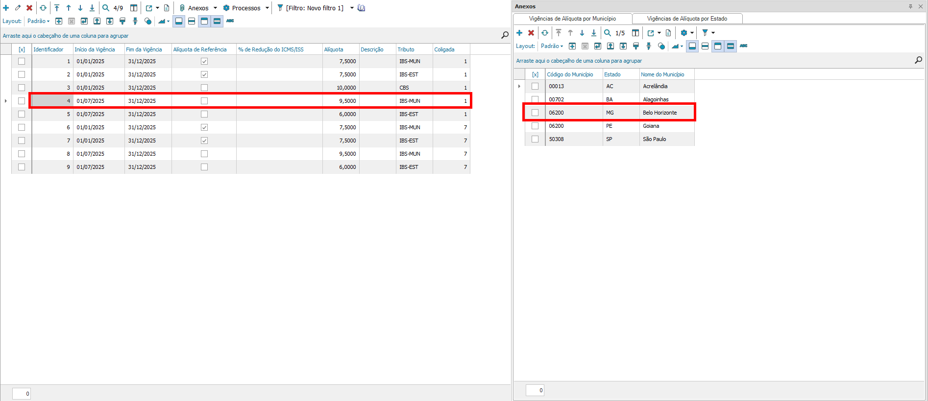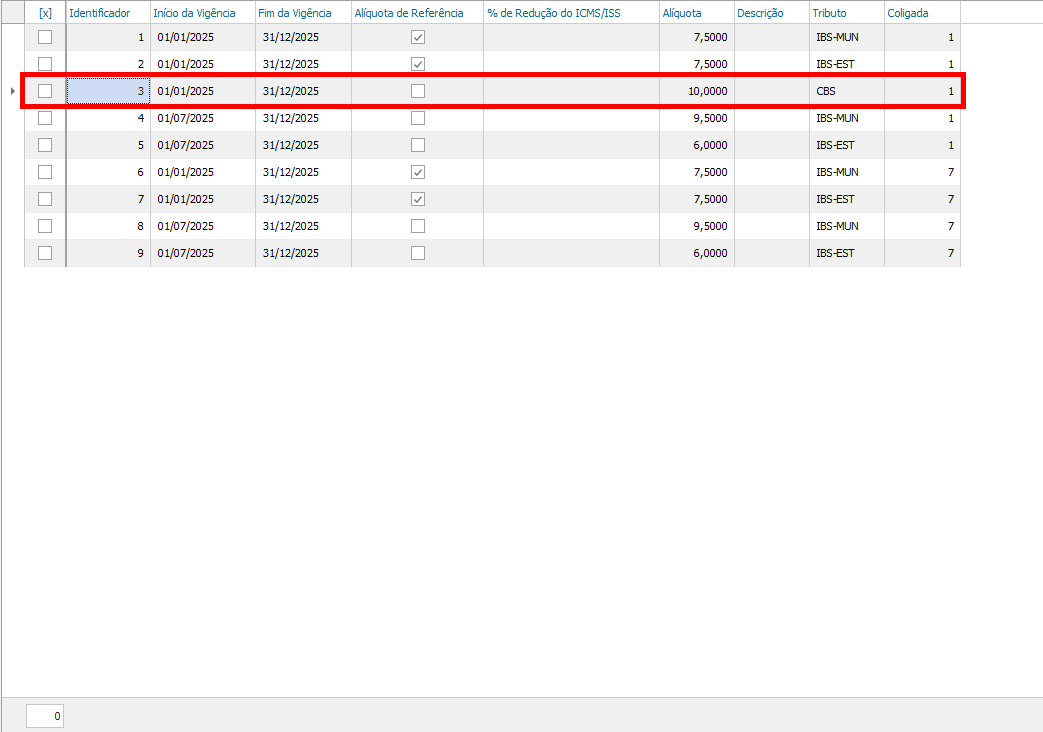 - Vigência cadastrada como alíquota de referência