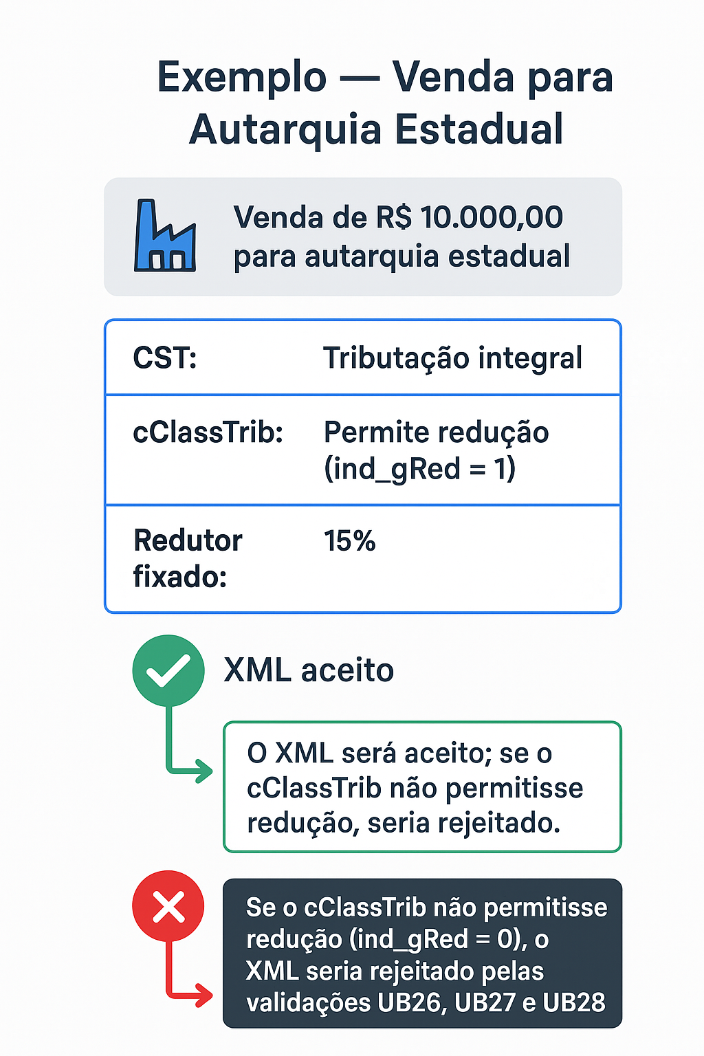 A Lei Complementar nº 214/2025, juntamente com a NT 2025.002-RTC, estabelece regras claras para a tributação das operações com órgãos públicos. Para evitar rejeições na NF-e, é fundamental compreender o CST, o cClassTrib e as tags XML relacionadas à redução de alíquota e à operação com ente governamental (gCompraGov). Com a evolução da NT 2025.002-RTC, o processo de validação dos documentos fiscais tornou-se mais rigoroso, exigindo coerência entre o CST, o cClassTrib e o preenchimento das tags de redução ou de operação governamental. Nesse contexto, as regras de validação UB26, UB27 e UB28 passaram a verificar automaticamente se o cClassTrib informado permite o uso das tags de redução, rejeitando XMLs inconsistentes e garantindo maior conformidade fiscal.